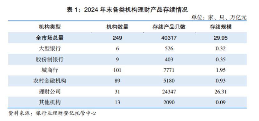 引入2024年银行理财年报数据:截至2024年末,全市场存续理财规模共计29.95万亿元,它们由218家银行机构和31家理财公司管理。