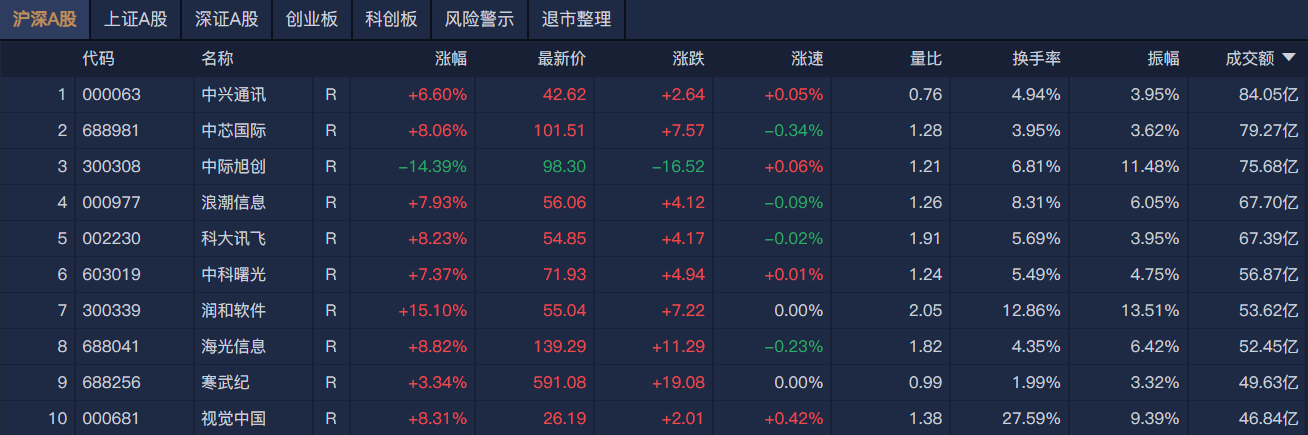 沪深两市半日成交额8651亿元,较上个交易日放量1311亿元。南财金融终端显示,个股方面,中兴通讯半日成交额超84亿元居首,中芯国际、中际旭创、浪潮信息成交额靠前。