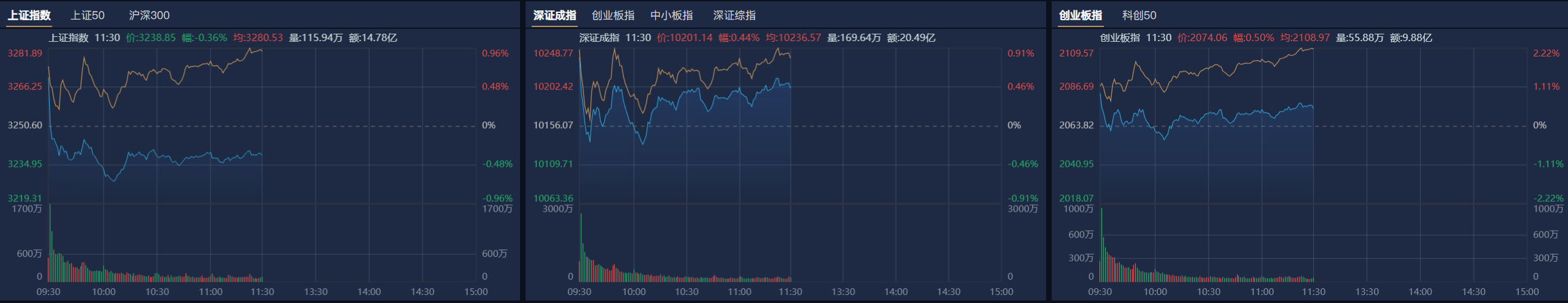 市场早盘震荡分化,创业板指领涨。南财金融终端显示,截至早盘收盘,沪指跌0.36%,深成指涨0.44%,创业板指涨0.5%。