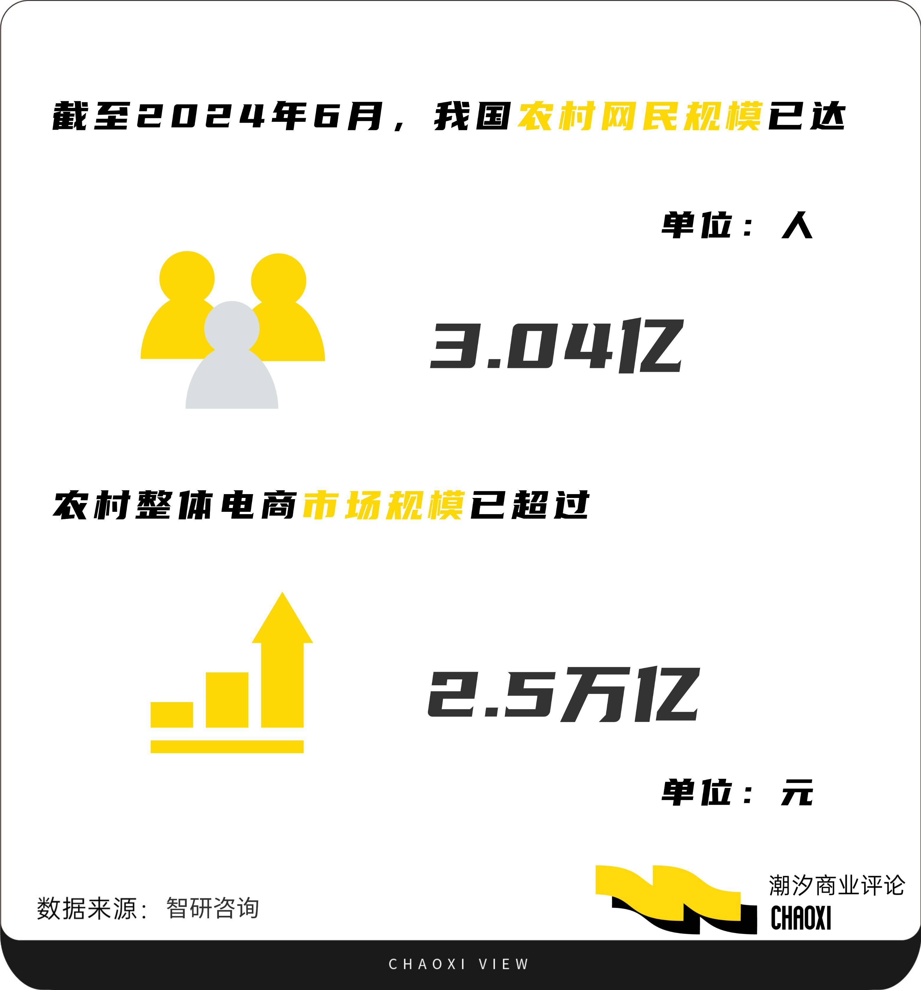 就平台方而言,在一、二线大中城市的流量红利逐步被释放完之后,往下走和扩张成为各大电商平台寻求有效的选择的必经之路。来自智研咨询的数据显示,截至2024年6月,我国农村网民规模已达3.04亿人,占网民整体的27.7%,且农村整体电商市场规模已超过了2.5万亿。