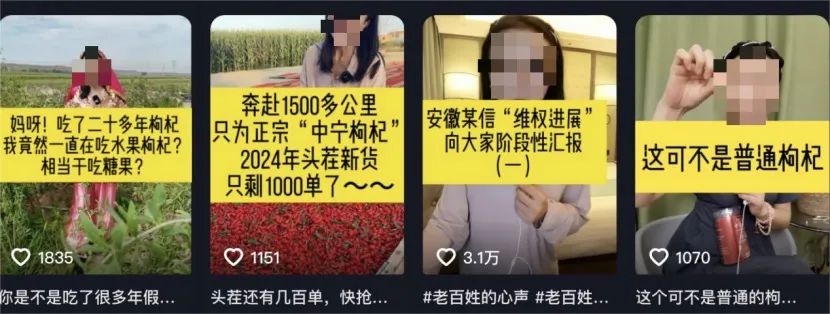 “维权式”带货是刘雯最常用的手段之一。2024年7月,她在短视频平台发布多条带货枸杞的视频,点赞数仅有1000多。但同期一条“维权”中国电信的视频,点赞数却暴涨至3.1万。找到流量密码的刘雯,开始在“维权”视频中巧妙植入带货内容。在一条抨击中国电信的视频中,她不经意地提到“正在宁夏中宁筛选枸杞”,随后发布的就是枸杞带货视频。