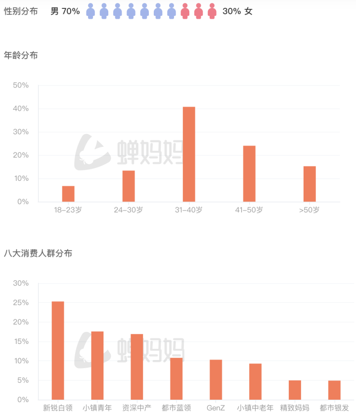 剖析刘雯的账号运营可以发现,网暴企业、质疑司法、挑动对立情绪是她的主要操作手法。这与其粉丝画像高度契合:蝉妈妈的数据显示,其男性粉丝占比约70%,以三线城市的小镇青年、新锐白领为主,50岁以上粉丝占比15.22%。这类粉丝普遍消费能力不强,这也解释了为什么刘雯的带货以粮油米面、内衣服饰为主,且10-20元的产品占八成的货盘。