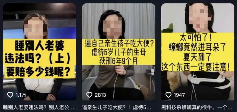 她的不少视频,直接把“逼自己亲生孩子吃大便”“睡别人老婆违法吗”“太可怕了!蟑螂竟然进耳朵了”等充满猎奇色彩的词汇放进标题,以期博取更多流量。