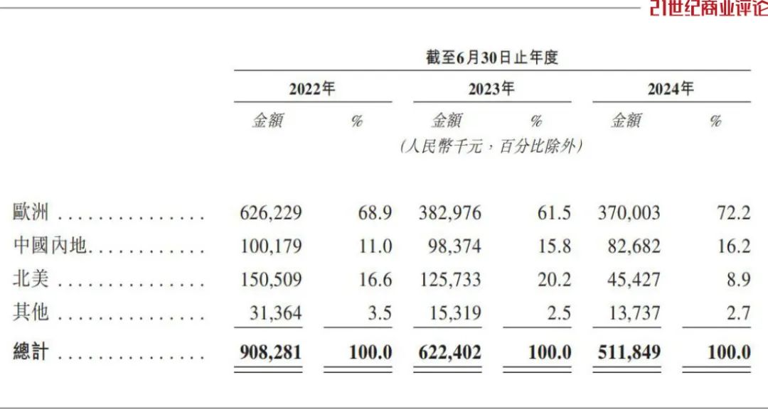 2024财年,欧洲市场入账3.7亿元,贡献七成收入;紧随其后,中国内地市场收入增长,贡献了16%的收入;北美市场的收入下滑,2024财年仅入账4542万元。