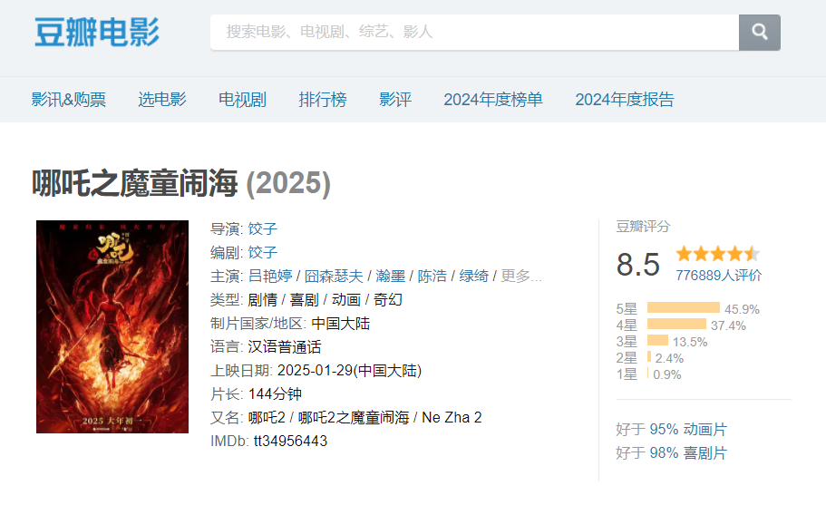 从数据上看,无论是观影人次还是总票房都创下了历史新高,用“杀疯了”来形容今年的春节档亦不为过。究其原因,首先是影片质量过硬,不仅题材类型多元化,涉及神话奇幻、悬疑喜剧、武侠、动画、军事动作等多种类型,能够充分满足不同观众的观影需求,而且故事情节和制作水平也是非常令人称赞。这当中,最受观众追捧的当属《哪吒之魔童闹海》,豆瓣评分达到了8.5分,并且已经成我国影史系列电影票房冠军,绝对算得上是一部史诗级影片,再度宣告了“国漫崛起”。