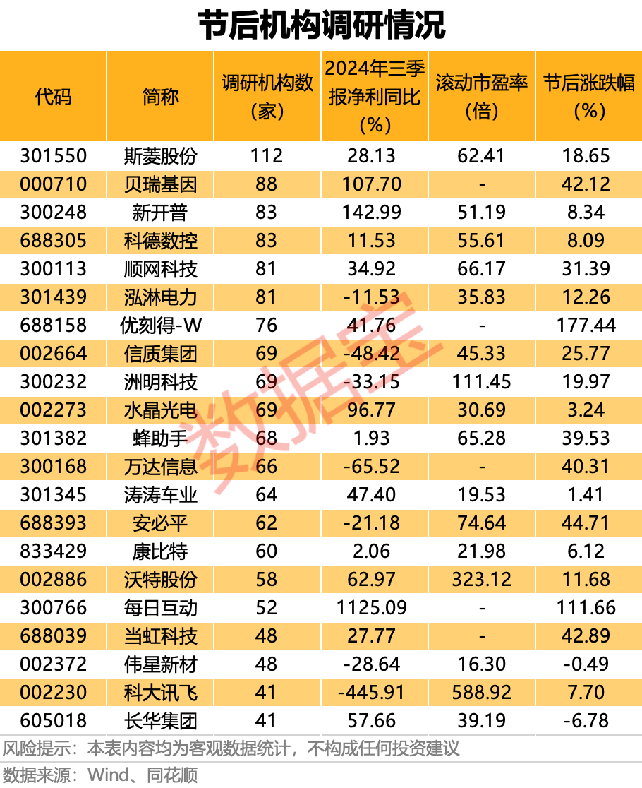 节后机构调研个股数量有180多只,斯菱股份成为唯一一只调研机构数超百家的股票。