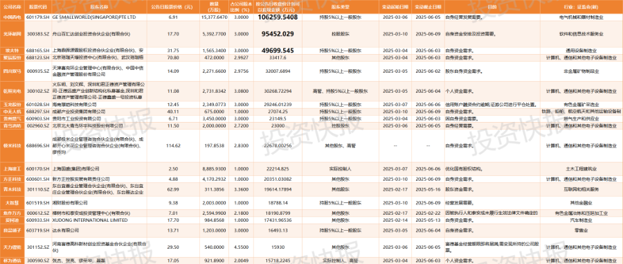 其中青鸟消防(002960.SZ),其控股股东北京北大青鸟环宇科技股份有限公司因自身经营需要,拟通过集中竞价和大宗交易方式减持不超过2000万股公司股份,占公司总股本的2.72%。按公告日收盘价计算,合计可套现约2.3亿元。