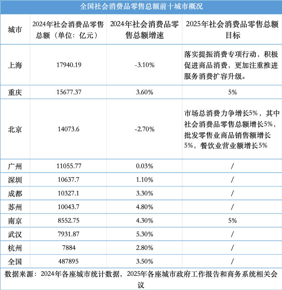 从经济体量上看,2024年消费破万亿元的城市仅有七座,包括北京、上海、广州、重庆、深圳、成都、苏州。