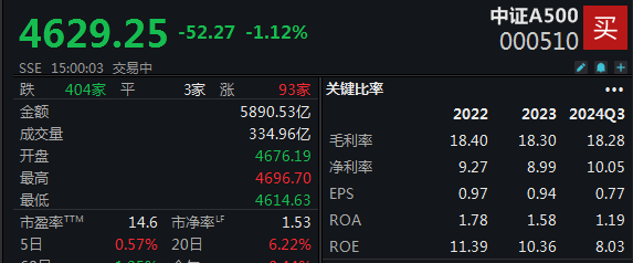 2月18日,市场午后持续走低,创业板指领跌。沪深两市全天成交额1.8万亿元,较上个交易日缩量1424亿元。中证A500指数(000510.SH)今日收盘下跌1.12%,报4629.25点。成分股中,有404家下跌。