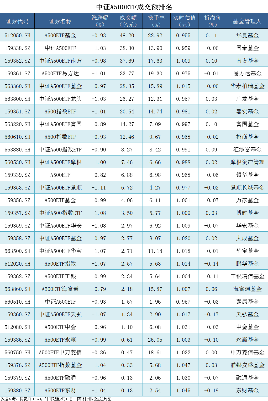 涨跌幅方面,29只中证A500ETF集体下跌,其中,A500ETF海富通跌幅最小,收跌0.79%,中证A500ETF景顺跌幅最大,收跌1.11%。