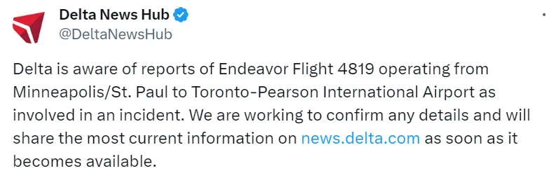 美东时间2月17日下午3:34,达美发布第一则声明表示,已经获悉从明尼阿波里斯飞往多伦多皮尔逊机场的Endeavor运营的4819航班发生了事故。