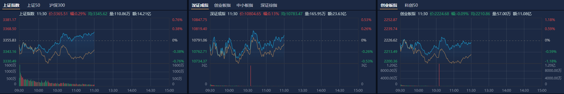 市场早盘探底回升,三大指数涨跌不一。南财金融终端显示,截至早盘收盘,沪指涨0.29%,深成指涨0.13%,创业板指跌0.09%。