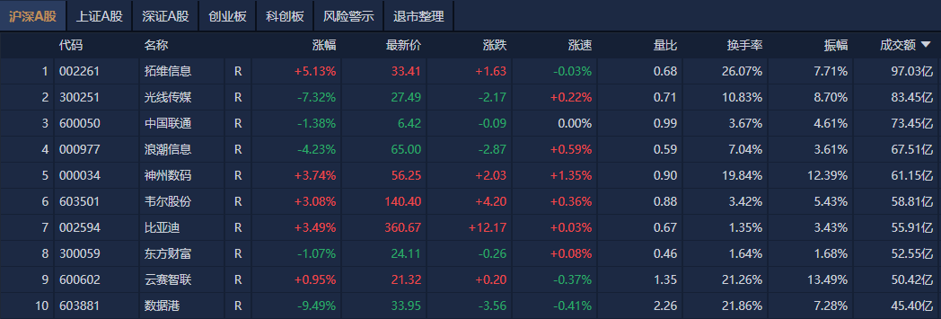 沪深两市半日成交额1.05万亿元,较上个交易日缩量2253亿元。个股方面,南财金融终端显示,拓维信息成交额超97亿元居首,光线传媒、中国联通、浪潮信息成交额靠前。
