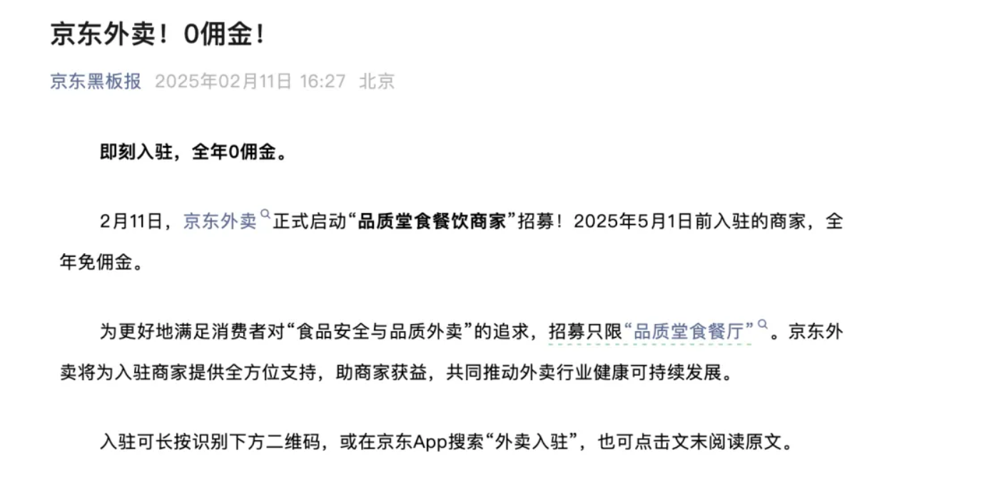 据京东官方微信公众号“京东黑板报”发布的消息,2月11日起,京东外卖启动“品质堂食餐饮商家”招募,并宣布在2025年5月1日前入驻的商家,可享受全年免佣金。
