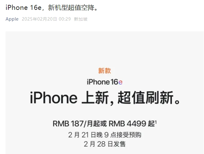 值得注意的是,就在2月20日凌晨,苹果如约发布“家族新成员”——iPhone 16e,售价4499元起,享受国补后3999元,定位中端。2月21日开放预购,2月28日正式发售。
