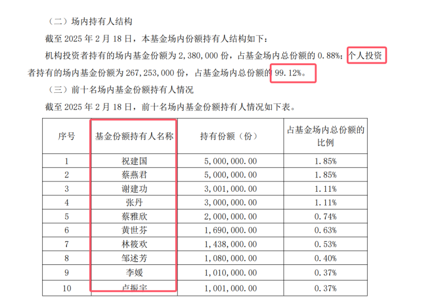 这种情况在2月14日开始上市交易的华夏创业板50ETF中,同样存在。根据华夏创业板50ETF的上市公告书,截至上市前,该ETF有96.47%的份额由个人投资者持有,前十大持有人中个人投资者占据了8席。