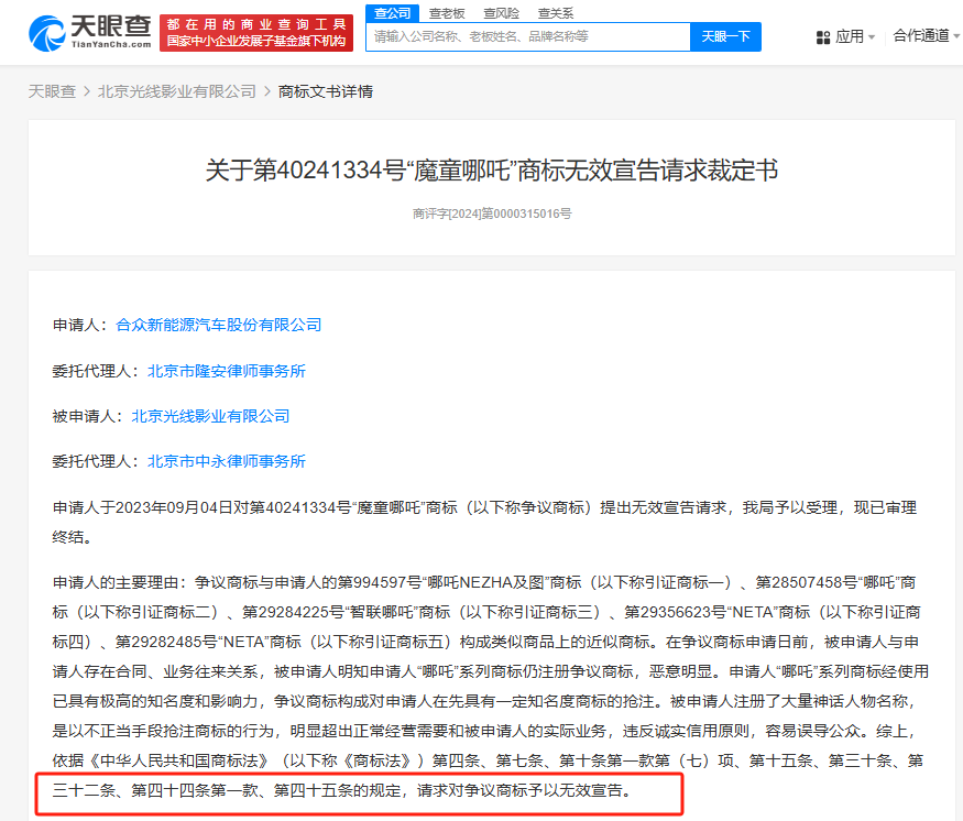 值得注意的是,哪吒汽车于2023年申请的一枚“魔小童”商标曾受到光线影业的异议,最终被商标局决定不予注册。此外,光线影业还申请对哪吒汽车所申请的哪吒大魔童、哪吒小魔童等商标进行无效宣告。