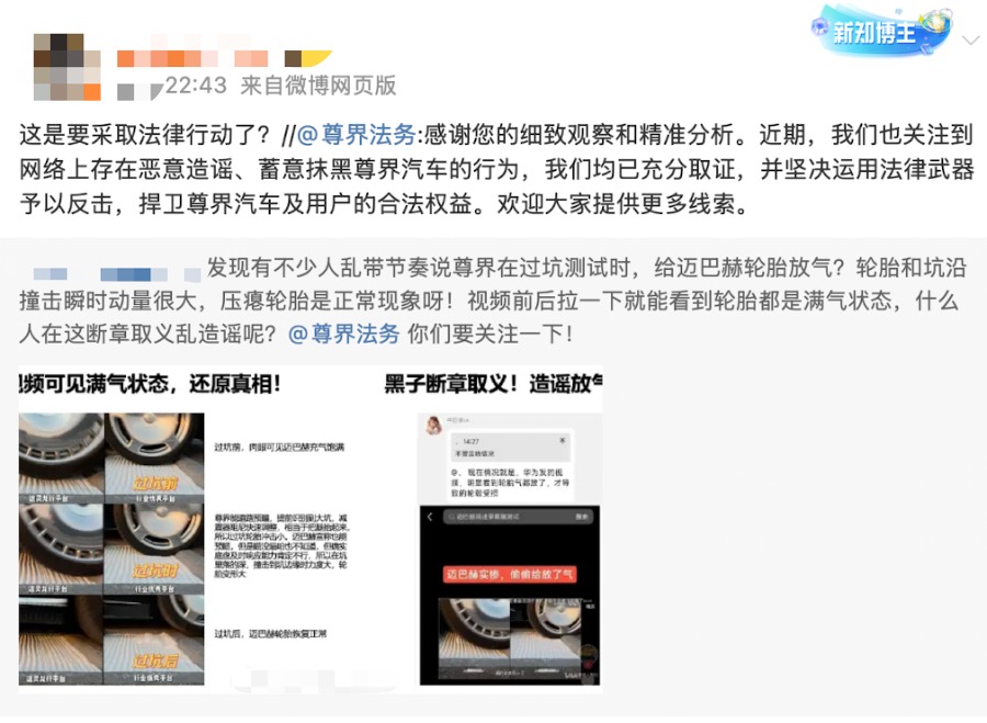 南财快讯·辟谣旋风队注意到,尊界法务官方在该微博评论区回应称:“感谢您的细致观察和精准分析。近期,我们也关注到网络上存在恶意造谣、蓄意抹黑尊界汽车的行为,我们均已充分取证,并坚决运用法律武器予以反击,捍卫尊界汽车及用户的合法权益。欢迎大家提供更多线索。”