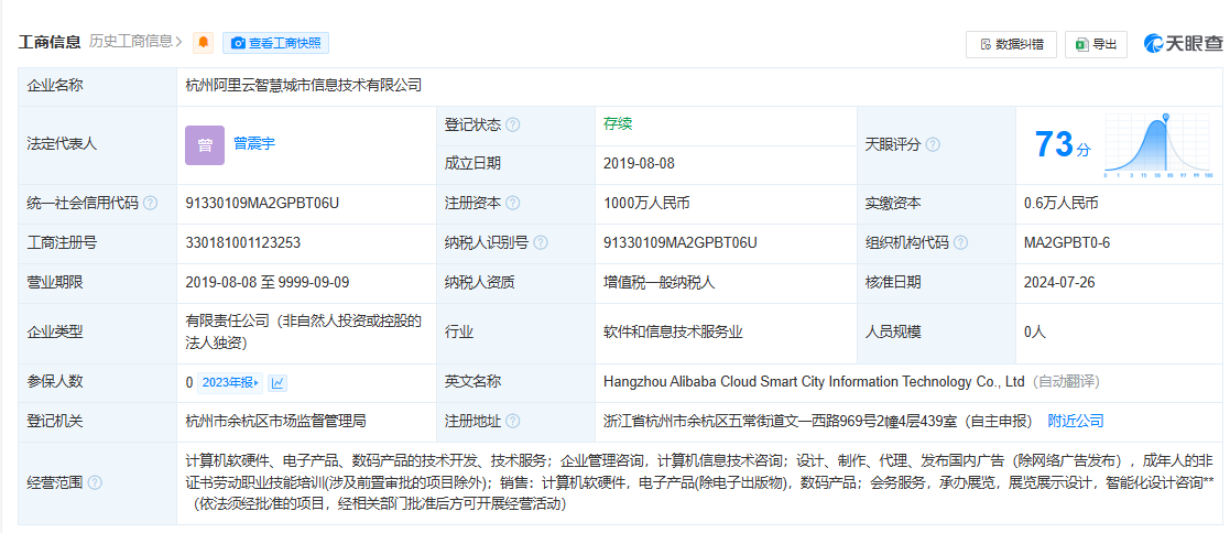 记者注意到,公告中提到,X公司企业性质为有限责任公司,全称为“杭州X公司”。天眼查显示,阿里云全资持股了一家名为杭州阿里云智慧城市信息技术有限公司的企业,企业性质也为有限责任公司。