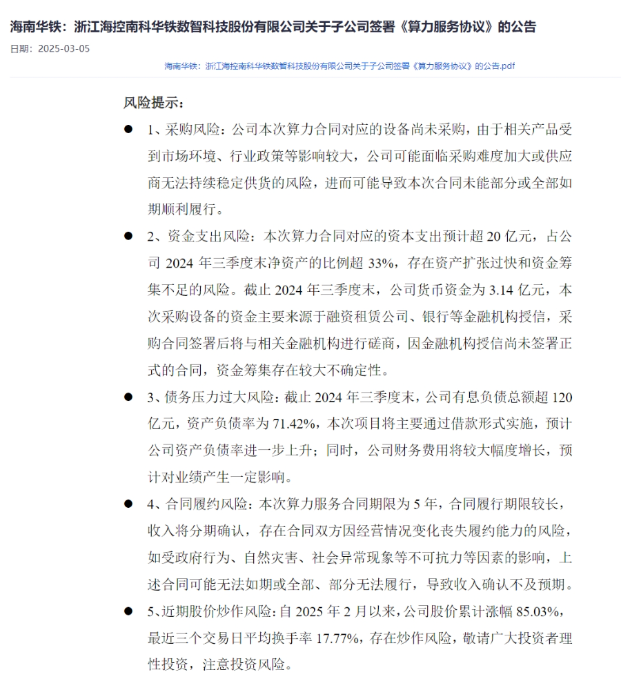 尽管签订了大单,但海南华铁提示风险称,本次算力合同对应的资本支出预计超20亿元,占公司2024年三季度末净资产的比例超33%,存在资产扩张过快和资金筹集不足的风险。