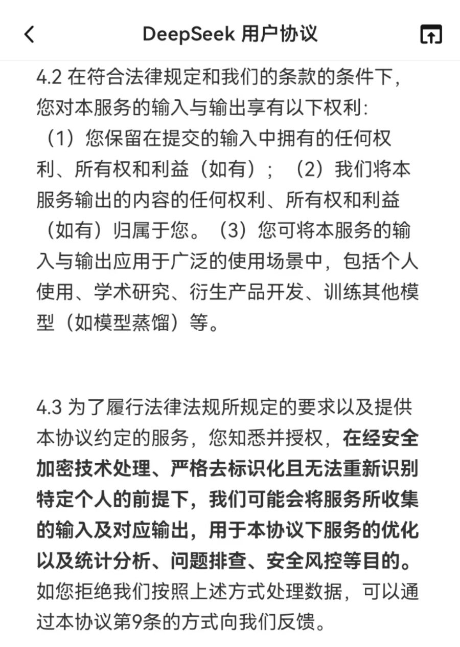 为了履行法律法规所规定的要求以及提供本协议约定的服务,您知悉并授权,在经安全加密技术处理、严格去标识化且无法重新识别特定个人的前提下,我们可能会将服务所收集的输入及对应输出,用于本协议下服务的优化以及统计分析、问题排查、安全风控等目的。如您拒绝我们按照上述方式处理数据,可以通过本协议第9条的方式向我们反馈。