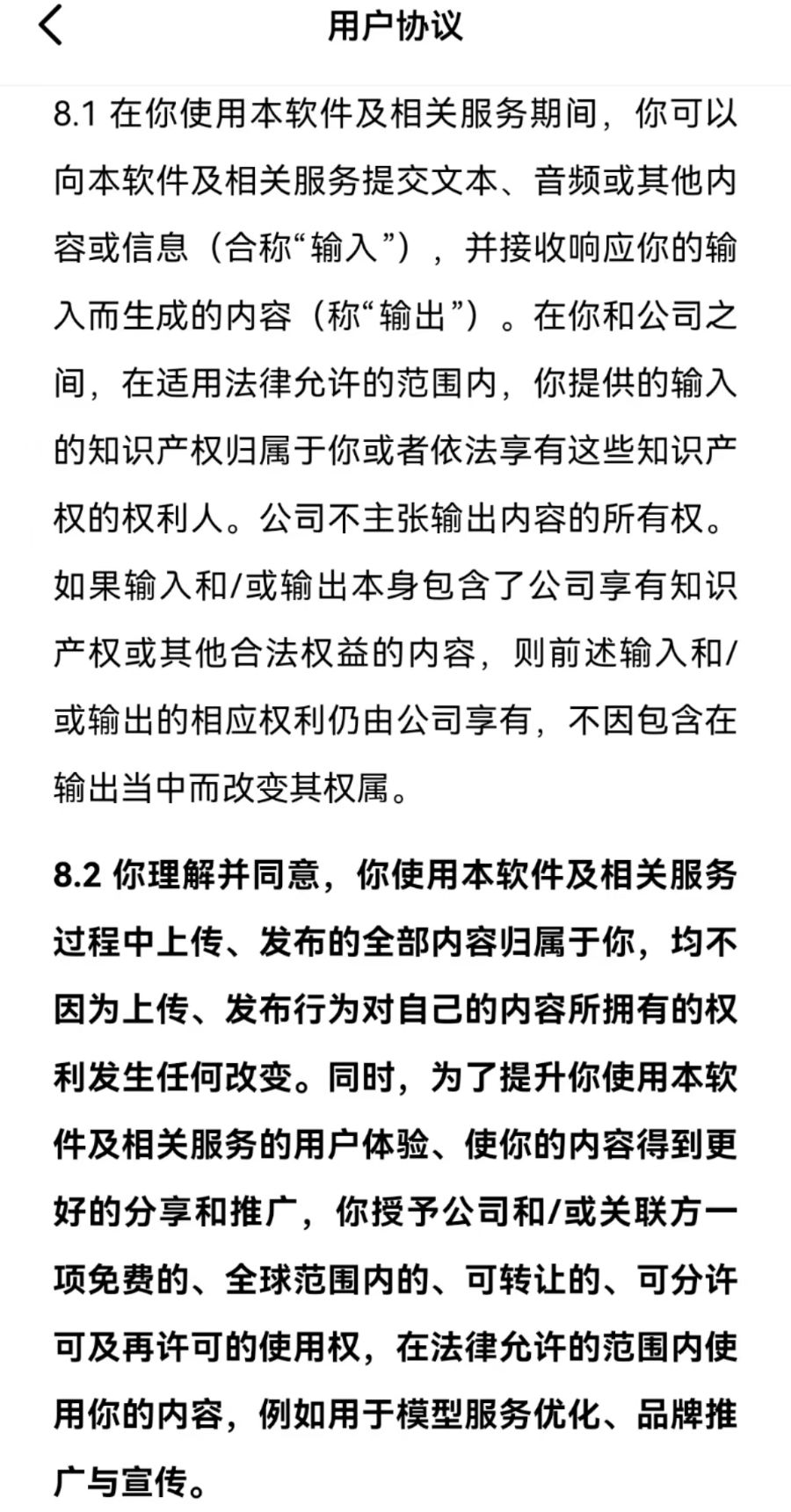 你理解并同意,你使用本软件及相关服务过程中上传、发布的全部内容归属于你,均不因为上传、发布行为对自己的内容所拥有的权利发生任何改变。同时,为了提升你使用本软件及相关服务的用户体验、使你的内容得到更好的分享和推广,你授予公司和/或关联方一项免费的、全球范围内的、可转让的、可分许可及再许可的使用权,在法律允许的范围内使用你的内容,例如用于模型服务优化、品牌推广与宣传。