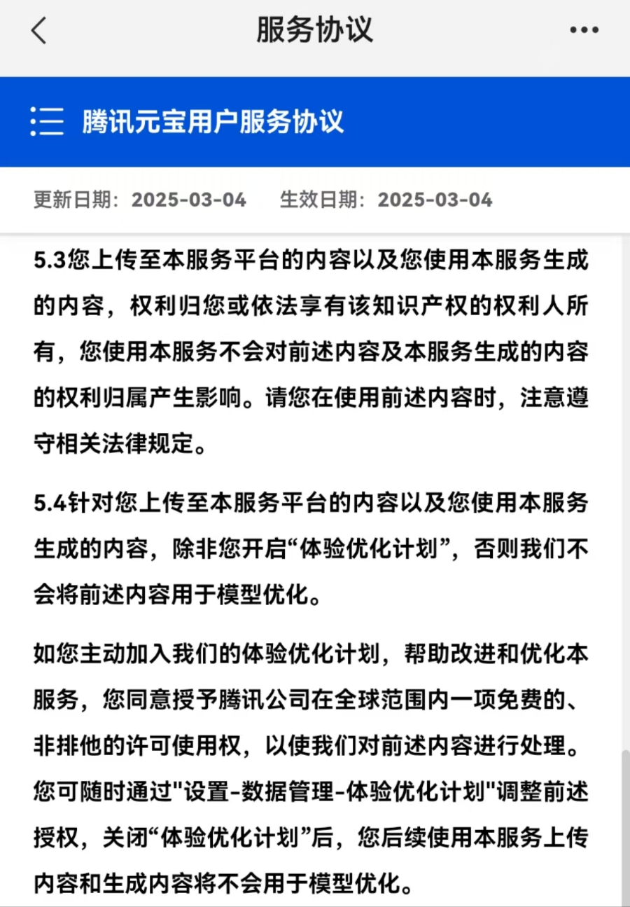 该人士表示,在腾讯元宝用户服务协议上也明确“上传至平台的内容以及所生成的内容,权利归用户或依法享有该知识产权的权利人所有,使用服务不会对权利归属产生影响”。