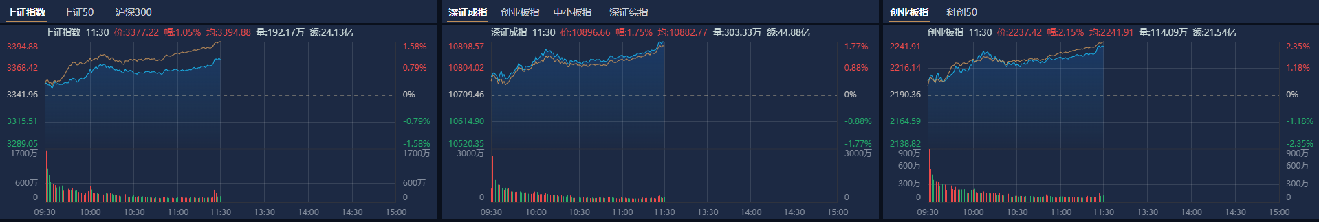市场早盘高开高走,创业板指领涨。南财金融终端显示,截至早盘收盘,沪指涨1.05%,深成指涨1.75%,创业板指涨2.15%。