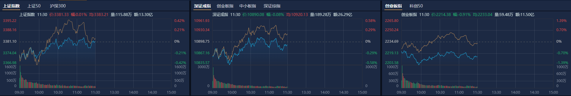 市场早盘震荡分化,三大指数涨跌不一。南财金融终端显示,截至早盘收盘,沪指涨0.01%,深成指跌0.08%,创业板指跌0.91%。