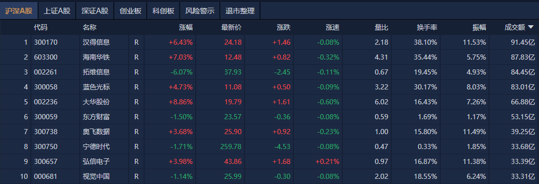 沪深两市半日成交额1.11万亿元,较上个交易日缩量552亿元。个股方面,南财金融终端显示,汉得信息成交额超91亿元居首,海南华铁、拓维信息、蓝色光标成交额靠前。
