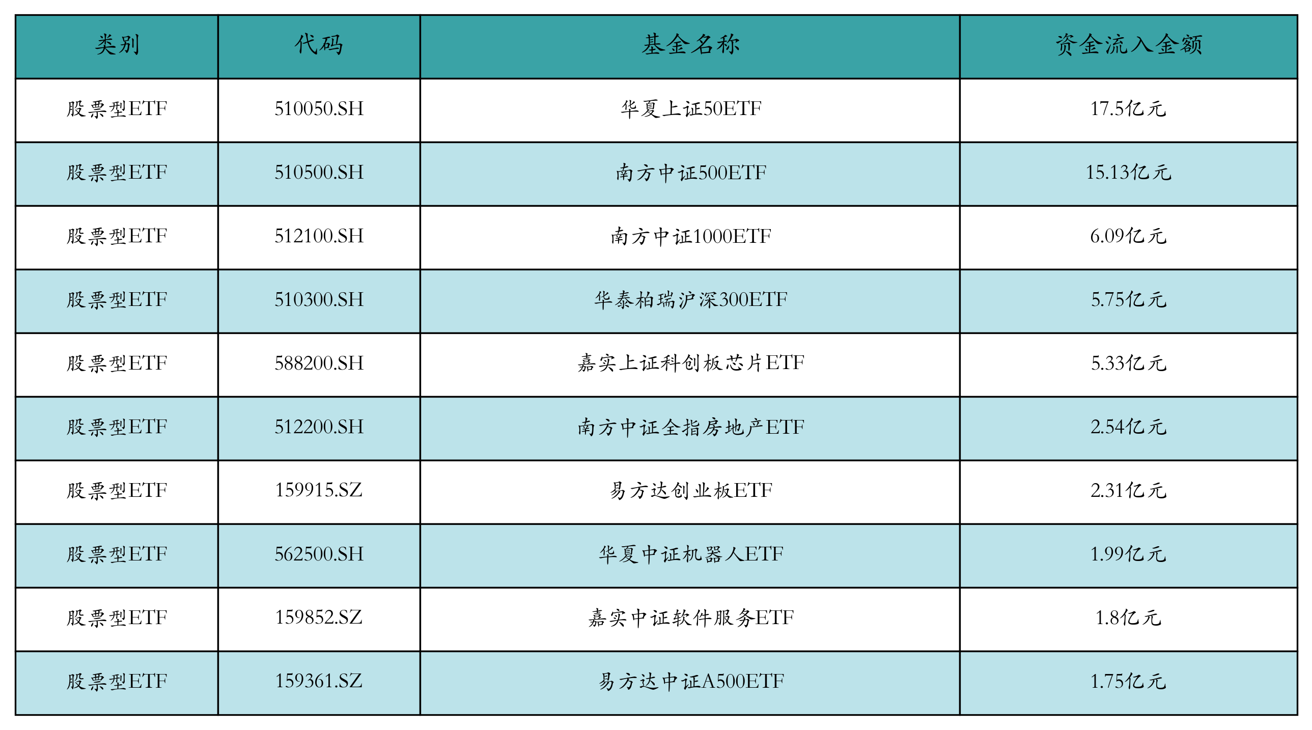 昨日股票型ETF资金流入最多的3支ETF及其流入金额分别为:华夏上证50ETF(流入17.5亿元)、南方中证500ETF(流入15.13亿元)、南方中证1000ETF(流入6.09亿元)。资金流入前10详情见下表: