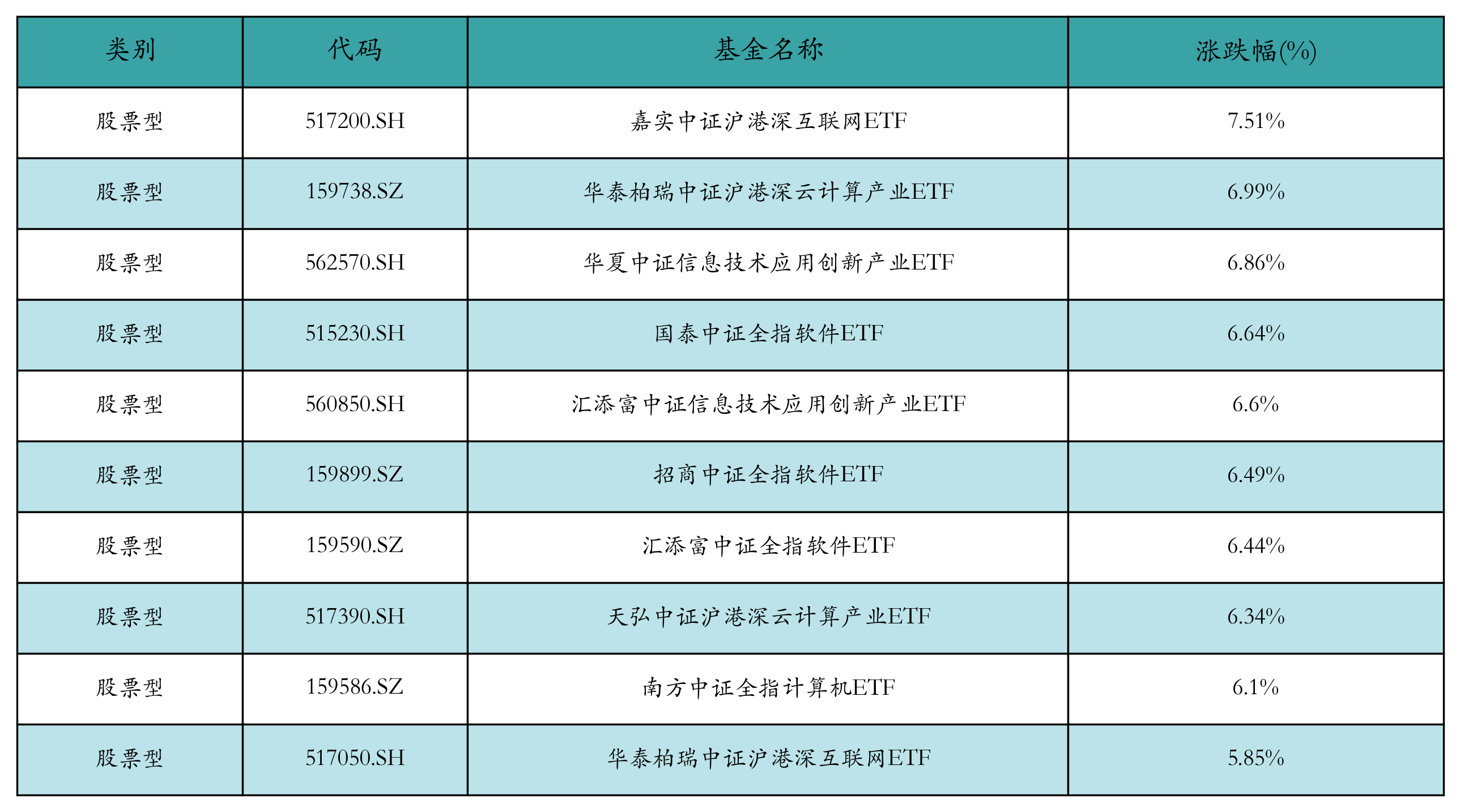 昨日股票型ETF涨幅最高的3支ETF及其收益率分别为:嘉实中证沪港深互联网ETF(7.51%)、华泰柏瑞中证沪港深云计算产业ETF(6.99%)、华夏中证信息技术应用创新产业ETF(6.86%)。涨幅前10详情见下表:
