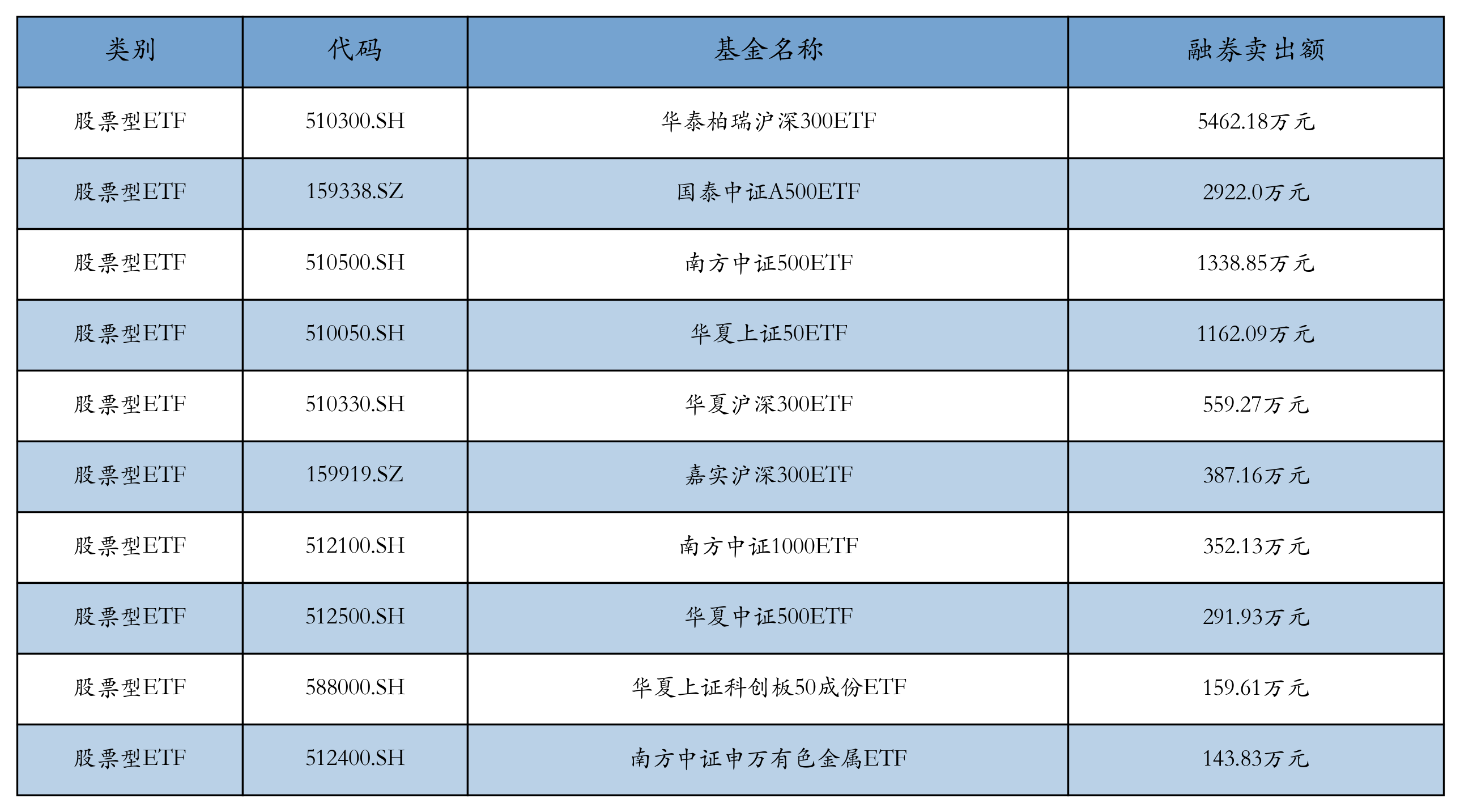 昨日股票型ETF融资卖出额最高的3支ETF及其卖出金额分别为:华泰柏瑞沪深300ETF(5462.18万元)、国泰中证A500ETF(2922.0万元)、南方中证500ETF(1338.85万元)。融券卖出额前10详情见下表: