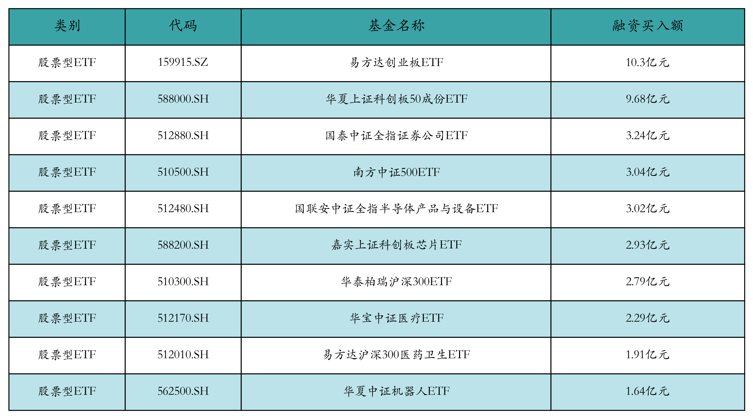 昨日股票型ETF融资买入额最高的3支ETF及其买入金额分别为:易方达创业板ETF(10.3亿元)、华夏上证科创板50成份ETF(9.68亿元)、国泰中证全指证券公司ETF(3.24亿元)。融资买入额前10详情见下表: