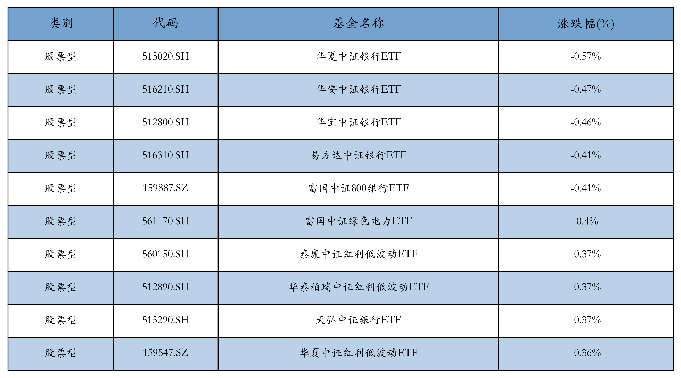 昨日股票型ETF跌幅最大的3支ETF及其收益率分别为:华夏中证银行ETF(-0.57%)、华安中证银行ETF(-0.47%)、华宝中证银行ETF(-0.46%)。跌幅前10详情见下表: