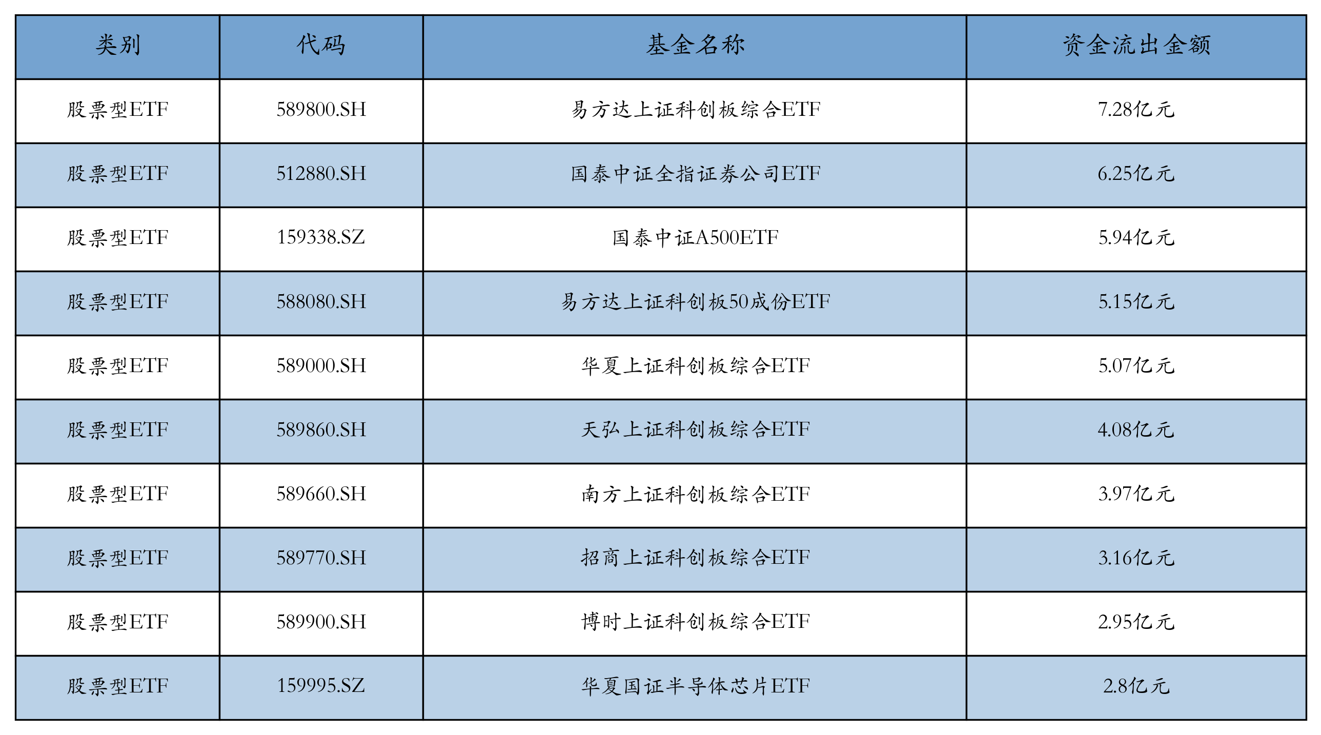 昨日股票型ETF资金流出最多的3支ETF及其流出金额分别为:易方达上证科创板综合ETF(流出7.28亿元)、国泰中证全指证券公司ETF(流出6.25亿元)、国泰中证A500ETF(流出5.94亿元)。资金流出前10详情见下表: