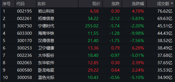 沪深两市半日成交额9805亿元,较上个交易日缩量1301亿元。个股方面,岩山科技成交额超76亿元居首,拓维信息、宁德时代、海南华铁成交额靠前。