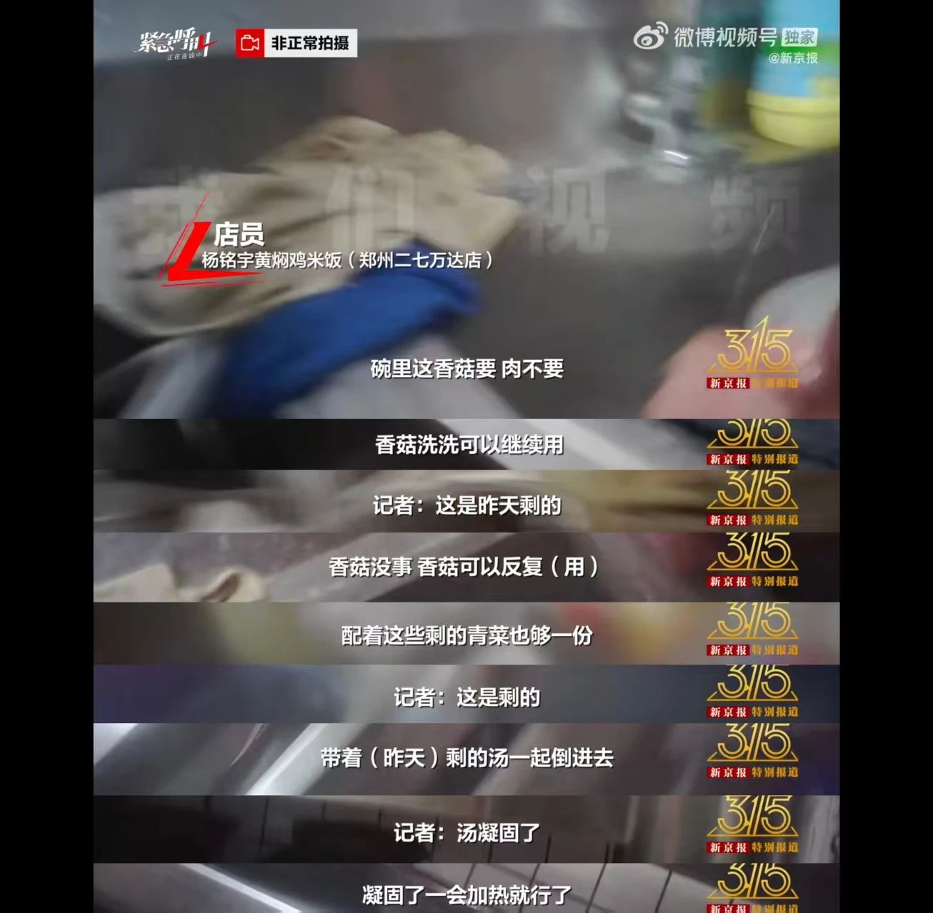 部分门店的店员会将顾客食用后的剩菜回收清洗,再从中挑出香菇等食材进行二次加工再售卖。有店员表示:“香菇没事,香菇可以反复用”。在制作牛腩煲时,店员将隔夜发黑的牛肉加色素后,用来冒充新鲜牛肉。面对味道已发酸的香菇、土豆等食材,在记者提出质疑时,店员却表示:“下次尽量多泡泡”“洗两遍就行了”。