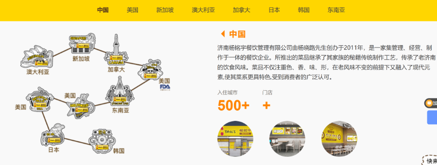 “杨铭宇黄焖鸡米饭”官网信息显示,自品牌创立十余年来,其加盟店已遍布全国23个省、5个自治区和4个直辖市,门店总数突破6000家。在美国、新加坡、澳大利亚等海外市场开有分店。