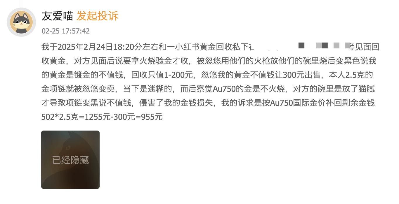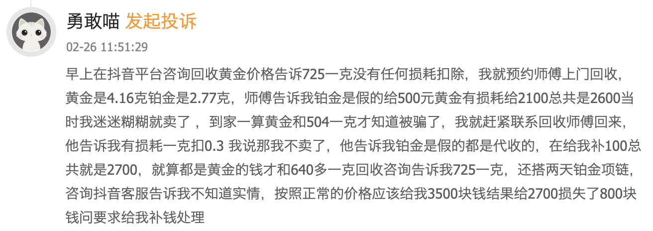 有消费者momo向蓝鲸记者爆料,她在社交软件上刷到了某家宣称免费上门的黄金回收商,回收价基本与大盘持平,咨询的时候说没有任何其他费用。但师傅上门后称的克重比实际要少,还坚持扣除500多元的涂层费。momo所遭遇的可能是最常见的回收骗局,即收取不合理费用和压价。