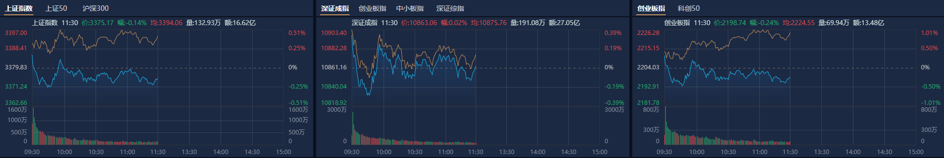 市场早盘震荡调整,三大指数涨跌不一。南财金融终端显示,截至早盘收盘,沪指跌0.14%,深成指涨0.02%,创业板指跌0.24%。