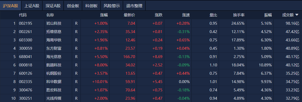 沪深两市半日成交额1万亿元,较上个交易日放量790亿。个股方面,岩山科技成交额超98亿元居首,拓维信息、海南华铁、东方财富成交额靠前。