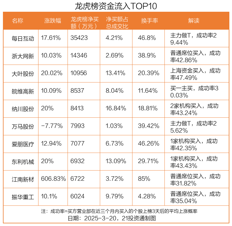 3月20日,上证指数下跌0.51%,深证成指下跌0.91%,创业板指下跌1%。盘后龙虎榜数据显示,共有44只个股因当日异动登上龙虎榜,资金净流入最多的是每日互动(300766.SZ),达3.54亿元。