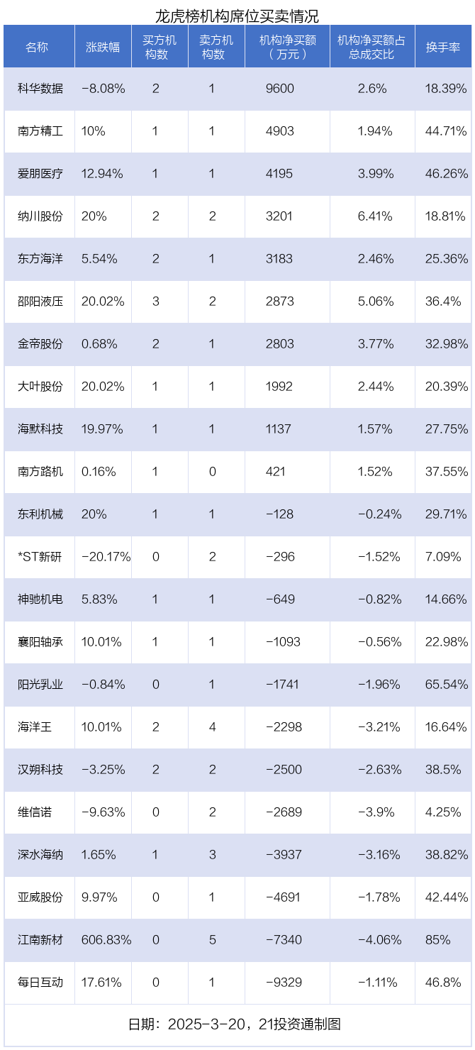 3月20日,22只个股龙虎榜出现了机构的身影,机构合计净卖出2381.16万元。具体来看,机构净买入10股,净卖出12股。