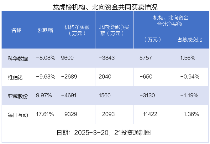 值得注意的是,机构和北向资金共同净卖出了每日互动;在维信诺,亚威股份,科华数据上出现分歧,机构净卖出维信诺2689.48万元,北向资金净买入2039.95万元;机构净卖出亚威股份4690.53万元,北向资金净买入1560.2万元;机构净买入科华数据9600.23万元,北向资金净卖出3843.01万元。
