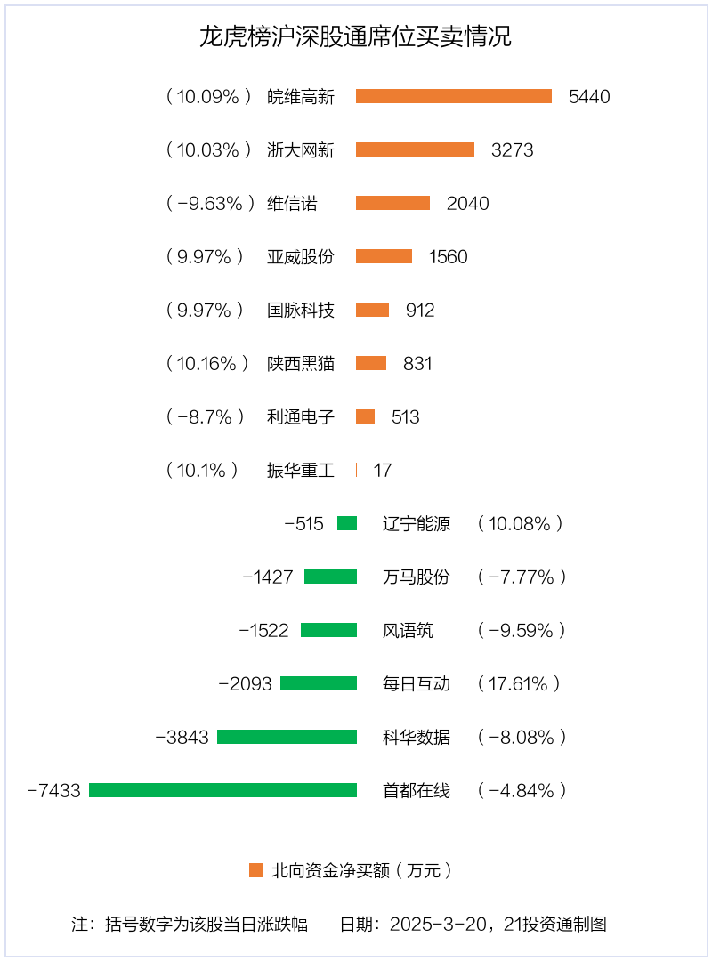 3月20日,北向资金参与龙虎榜中的个股共有14只,合计净卖出2246.56万元。其中沪股通净买入5 股,净卖出2 股,合计净买入8036.36万元;深股通净买入3 股,净卖出4 股,合计净卖出1.03亿元。