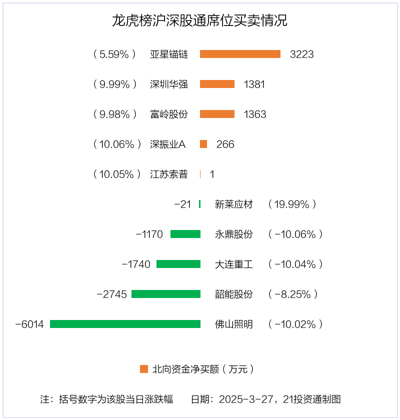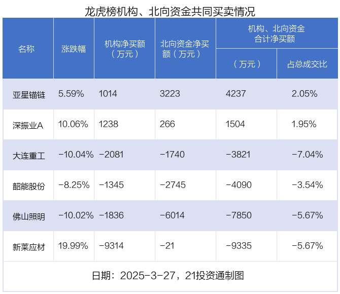 值得注意的是,机构和北向资金共同净买入了亚星锚链、深振业A等2股;共同净卖出了新莱应材、大连重工、韶能股份、佛山照明等4股。