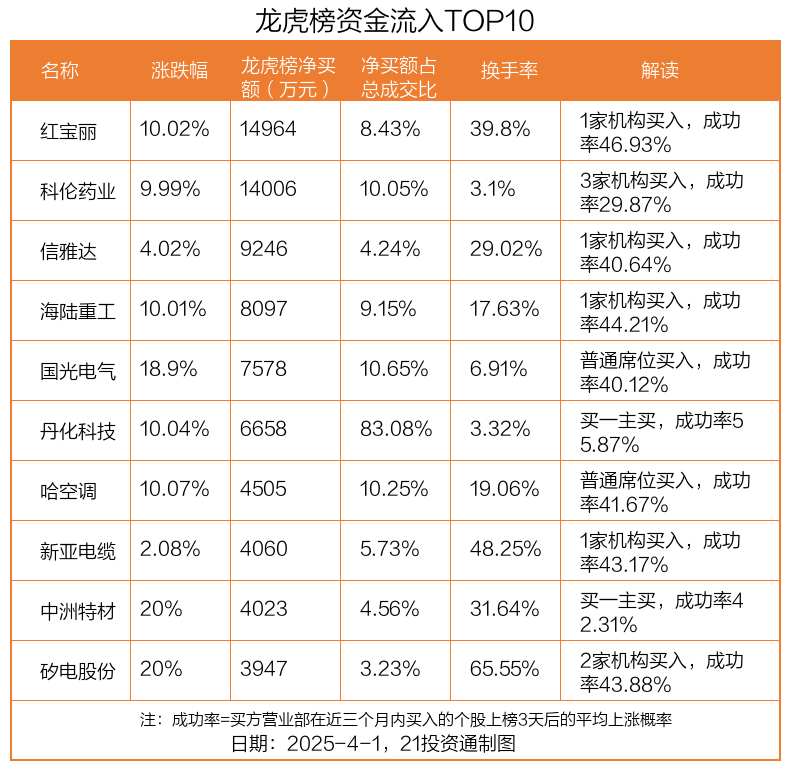 4月1日,上证指数上涨0.38%,深证成指下跌0.01%,创业板指下跌0.09%。盘后龙虎榜数据显示,共有55只个股因当日异动登上龙虎榜,资金净流入最多的是红宝丽(002165.SZ),达1.5亿元。