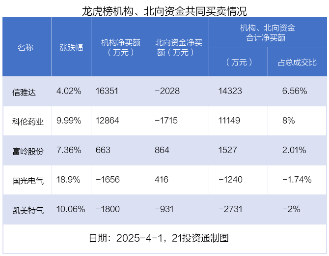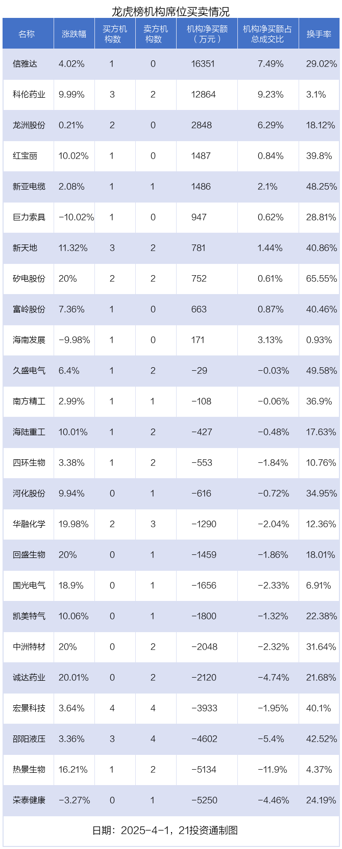4月1日,25只个股龙虎榜出现了机构的身影,机构合计净买入7323.11万元。具体来看,机构净买入10股,净卖出15股。