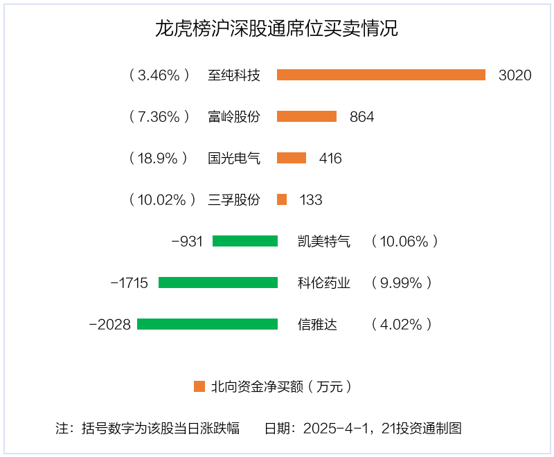 4月1日,北向资金参与龙虎榜中的个股共有7只,合计净卖出240.61万元。其中沪股通净买入3 股,净卖出1 股,合计净买入1541.61万元;深股通净买入1 股,净卖出2 股,合计净卖出1782.22万元。